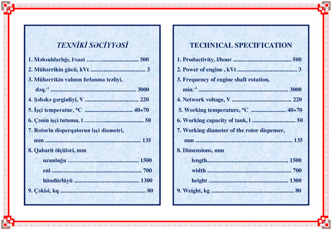 Tarix: 11 avqust 2020-ci il.“Rotorlu disperqator” qurğusuna Rusiya Federasiyasının Əqli Mülkiyyətin Patent və Əmtəə Nişanı üzrə federal Qulluq Qurumundan (Rospatent) patenti alınmışdır. (RF № 2720776, 2020-ci il).TƏBRİK EDİRİK!Bu qurğunun iş prinsipi aşağıdakı kimidir. Emal olunması nəzərdə tutulan üzlü süd əvəzedicisinin birləşmələri ardıcıllıqla, ilk olaraq mayeli və daha sonralar quru maddələr həcmə daxil edilir. Həcm yükləndikdən sonra, maye 40°C – dək qızdırılır və mühərrik işə salınmaqla rotorlu disperqator dövrü hərəkət başlayır. İş prosesi zamanı bu aparat 3000 dövr / dəqiqə sürətlə həcmin daxilindəki birləşmələri qarışdırmağa başlayır. Bu zaman disperqasiya, homogenləşmə və qarışdırılma ardıcıl olaraq eyni zamanda aparılır. Məhsul hazırlandıqdan sonra yönləndirici və hərəkət mexanizmin köməkliyi ilə qurğu hərəkətə gətirilərək buzovlar olan yerə istiqamətləndirilir.